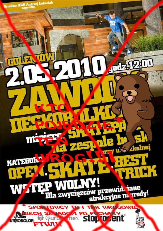 Chłopaki z BlingBling ze Szczecina wzywają do bojkotu zawodów, które mają się odbyć za niecały miesiąc w Goleniowie – gdzieś pod Szczecinem i Stargardem. A czemu bojkot bo sponsoruje je gurugomez, który jakimś cudem odnalazł w sobie przyjaciół w postaci turobokolor i dystrybucji uniform czyli deskorolka.com. Może jednak myliliśmy się w stosunku do GG, oni naprawdę chcą nam pomóc rozdając swoje koszulki i ocieplając w ten sposób swój wizerunek? Haha nie wiem ale powodzenia.